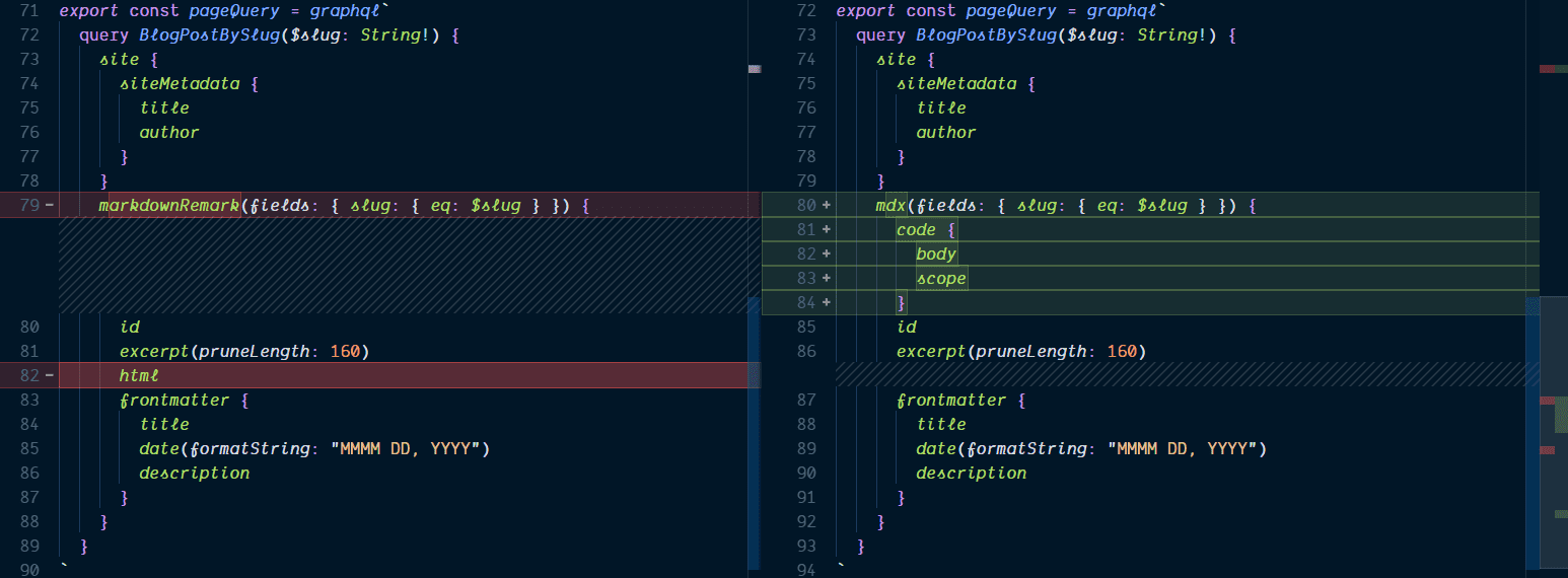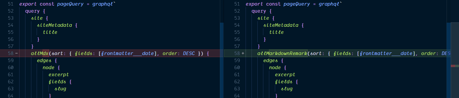 Again in the query we’re replacing markdownRemark with mdx and